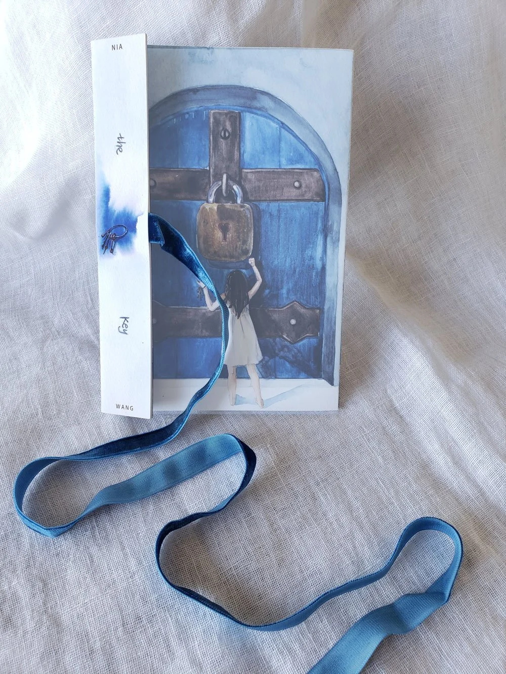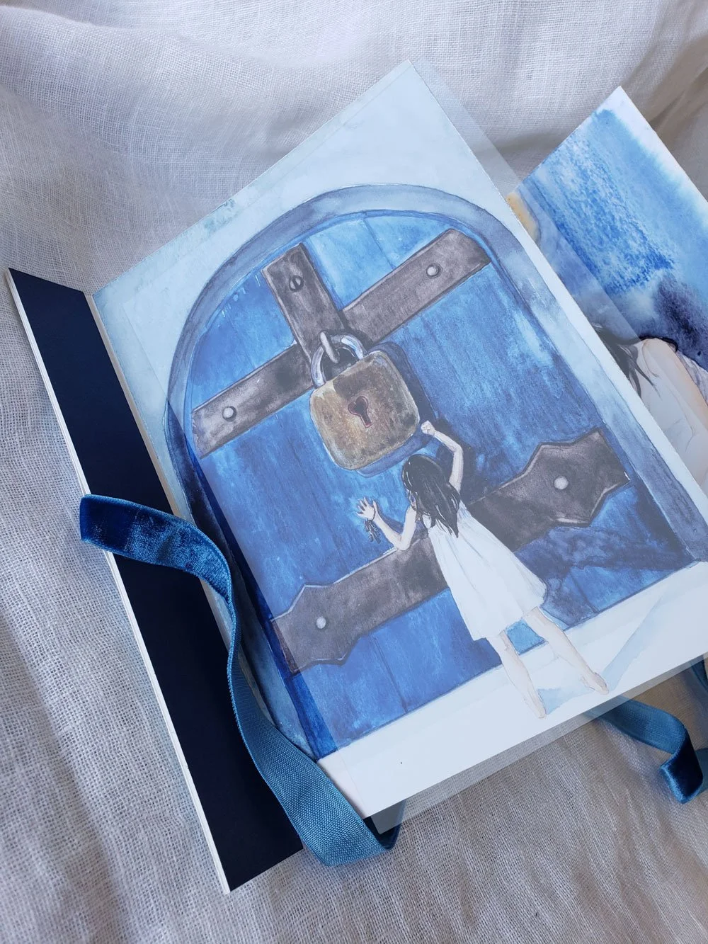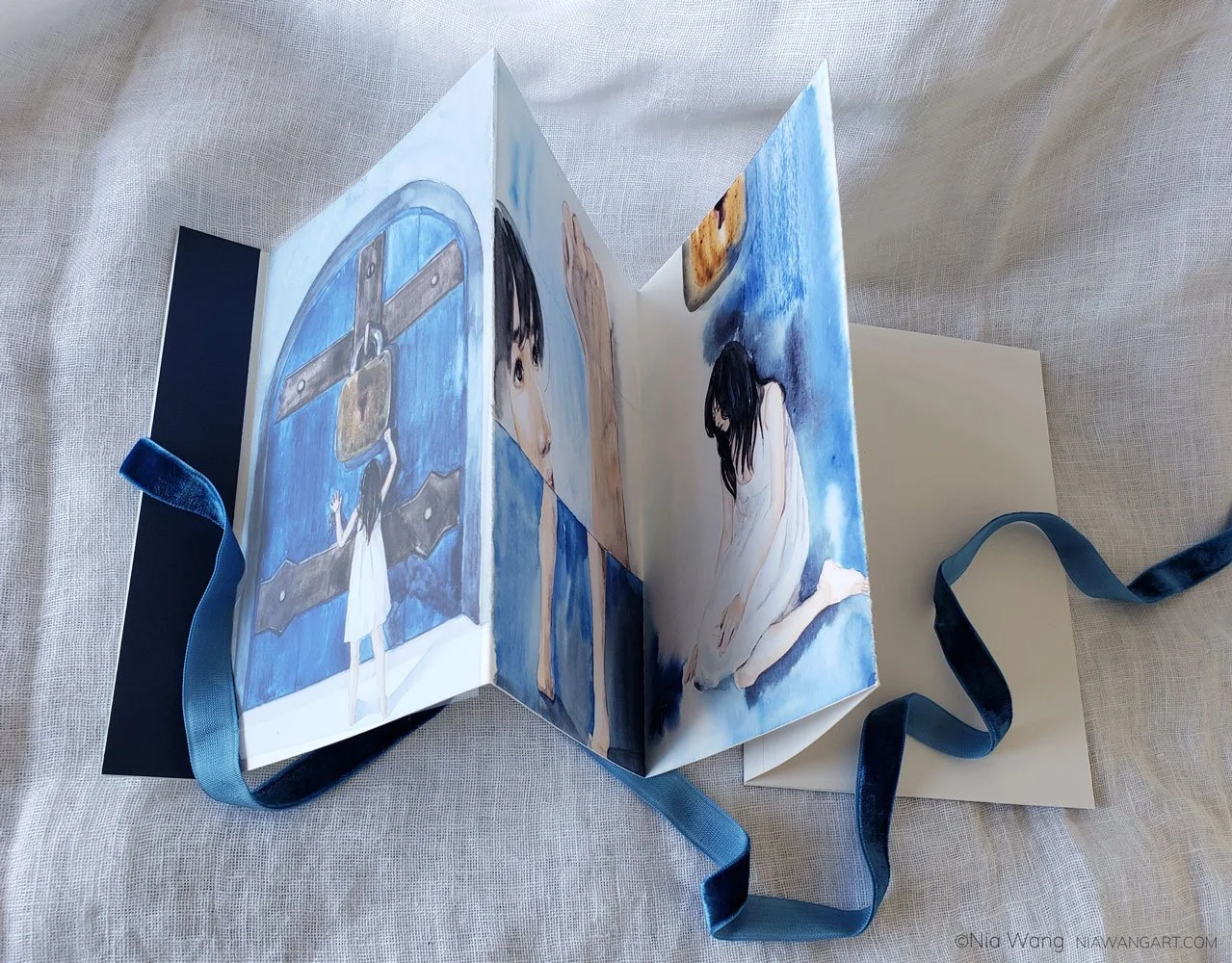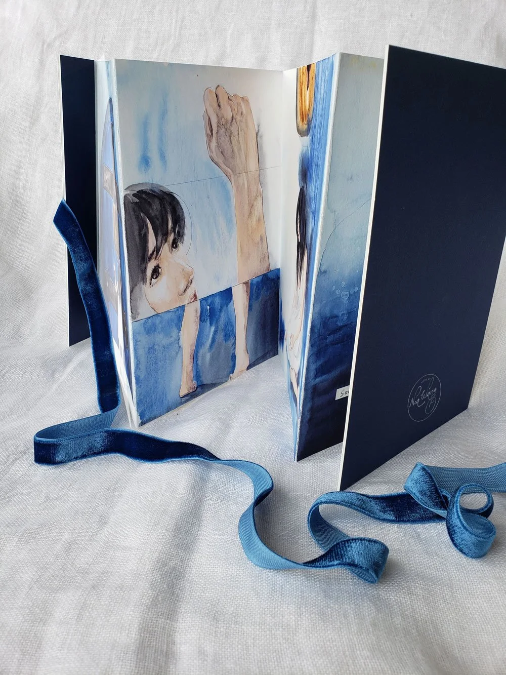 An accordion storybook about two hearts, fastened by a velvet ribbon.